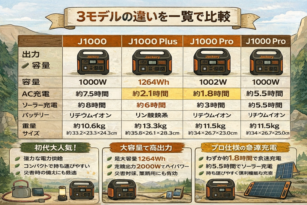 Jackery 1000シリーズの3モデルの違いをまとめると: