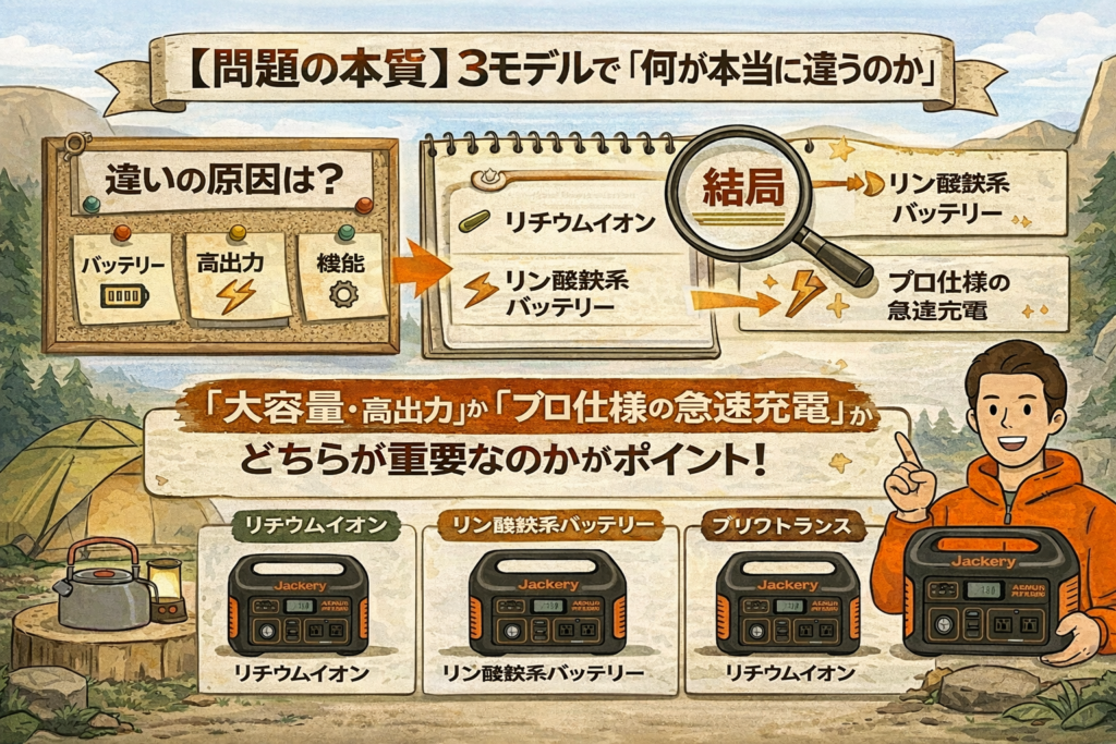 私自身も、最初にJackeryを購入しようとしたとき、「1000シリーズだけで3種類もあるの!?」と頭を抱えた経験があります。スペック表を並べてみても、数字の羅列ばかりで直感的に違いがわかりにくいんですよね。