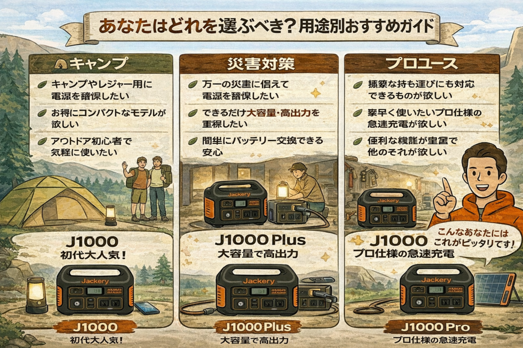 - Jackery 1000:コスパ重視・たまに使う用途向け(充電遅い・寿命短め)
