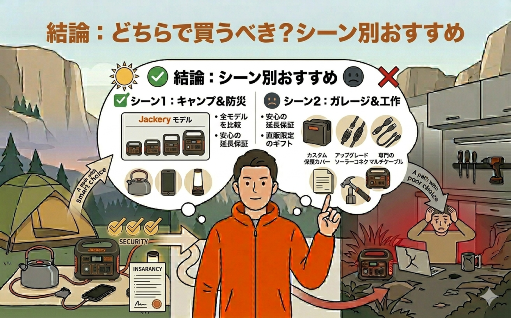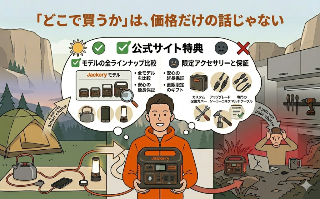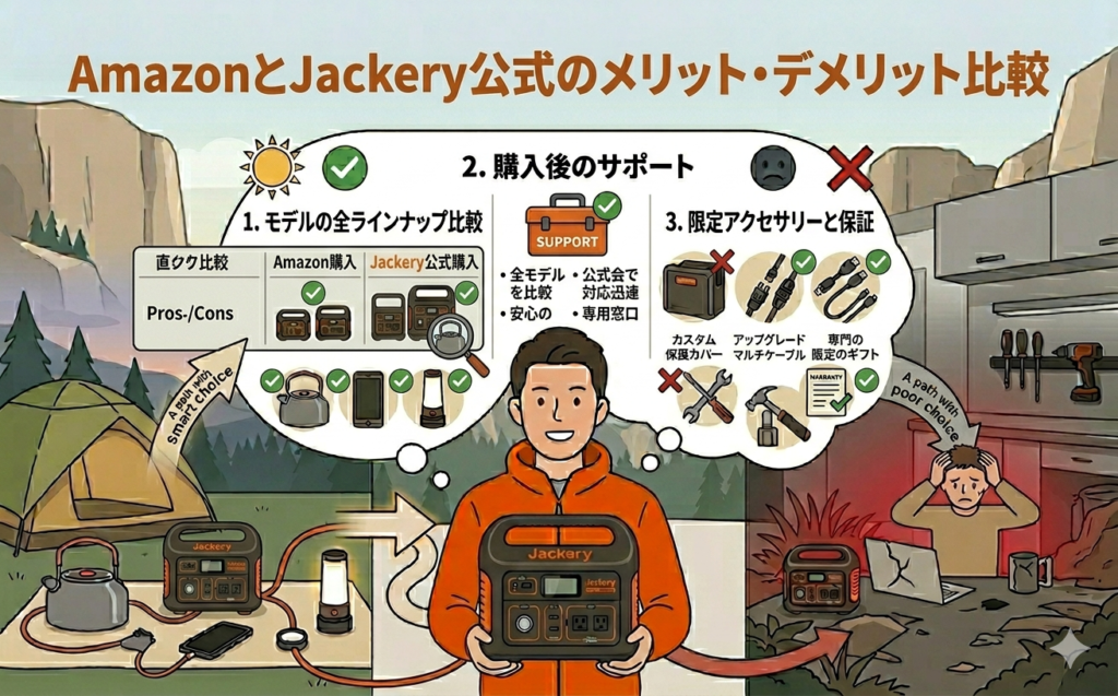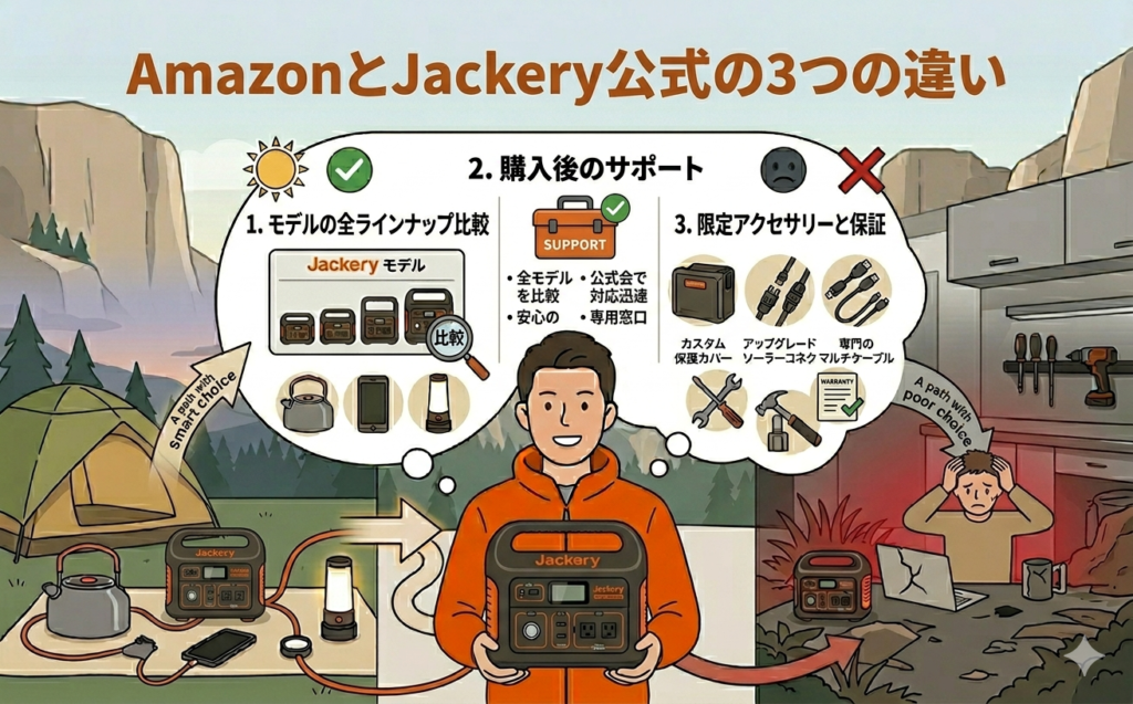 お悩みリーマン「JackeryってAmazonで買うのと公式サイトで買うのって何が違うの?」