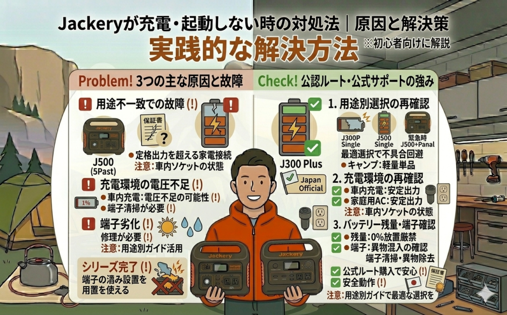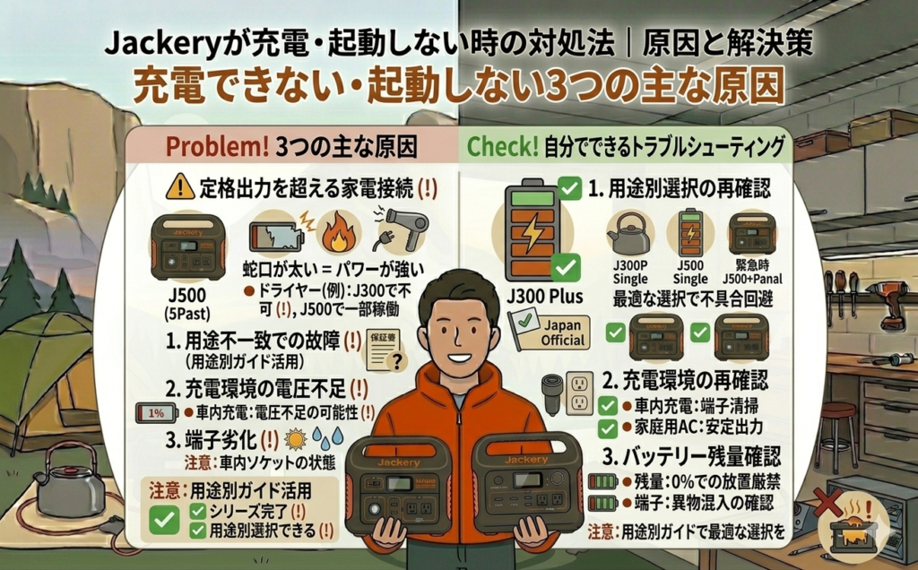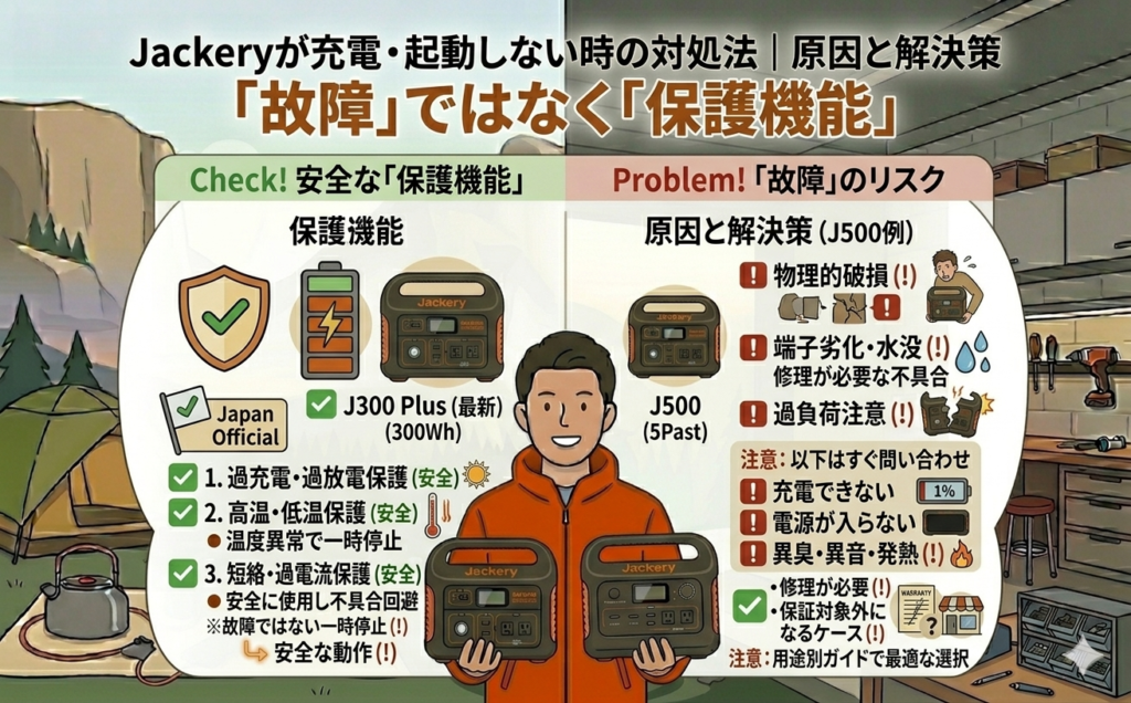 私自身も以前、真冬の車中泊から帰ってきた翌朝にJackeryが起動せず、「数万円が水の泡になったか」と血の気が引いた経験があります。ですがその時も、そして相談を受けたほぼ全てのケースでも、結論から言うとほとんどのケースは故障ではなく、ちょっとした原因で解決します