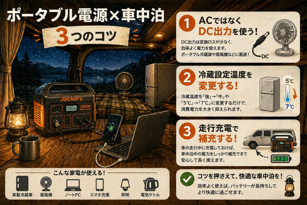 モデルを大きくするだけでなく、使い方を工夫することで1泊あたりの消費電力を大幅に削減できます。私が実際の車中泊で効果を実感した3つのコツを紹介します。