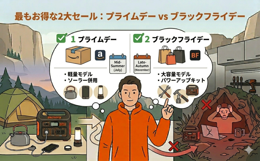 • Jackeryのセールは年間複数回あり、7月のプライムデーと11月のブラックフライデーが最大の狙い目