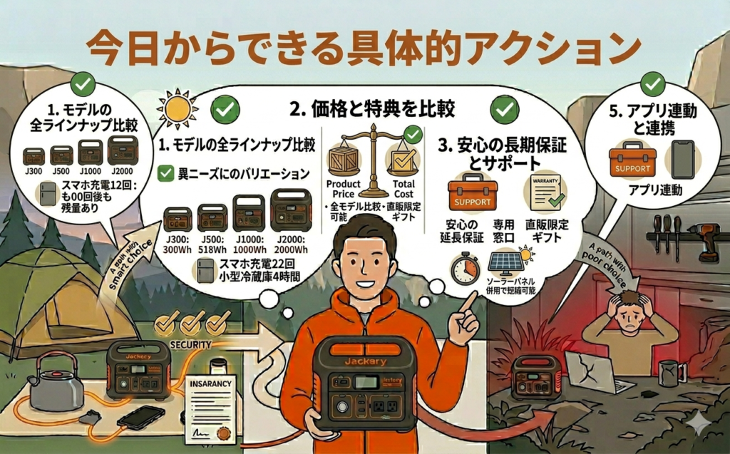 私自身の経験では、ポータブル電源は「少し大きめ」「ソーラーは少し多め」のW数を買っておくと後悔が少ないです。モノを増やしたくない方は最初からセット(200W付き)の上位モデルをひとつ買う方が長期的に満足度が高い傾向にあります。