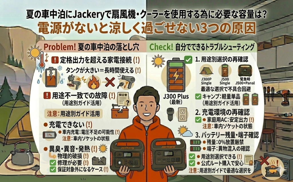 この記事では、Jackeryを使って扇風機やポータブルクーラーをどう運用すれば一晩を涼しく過ごせるのか、容量別の具体シミュレーションとともに解説します!